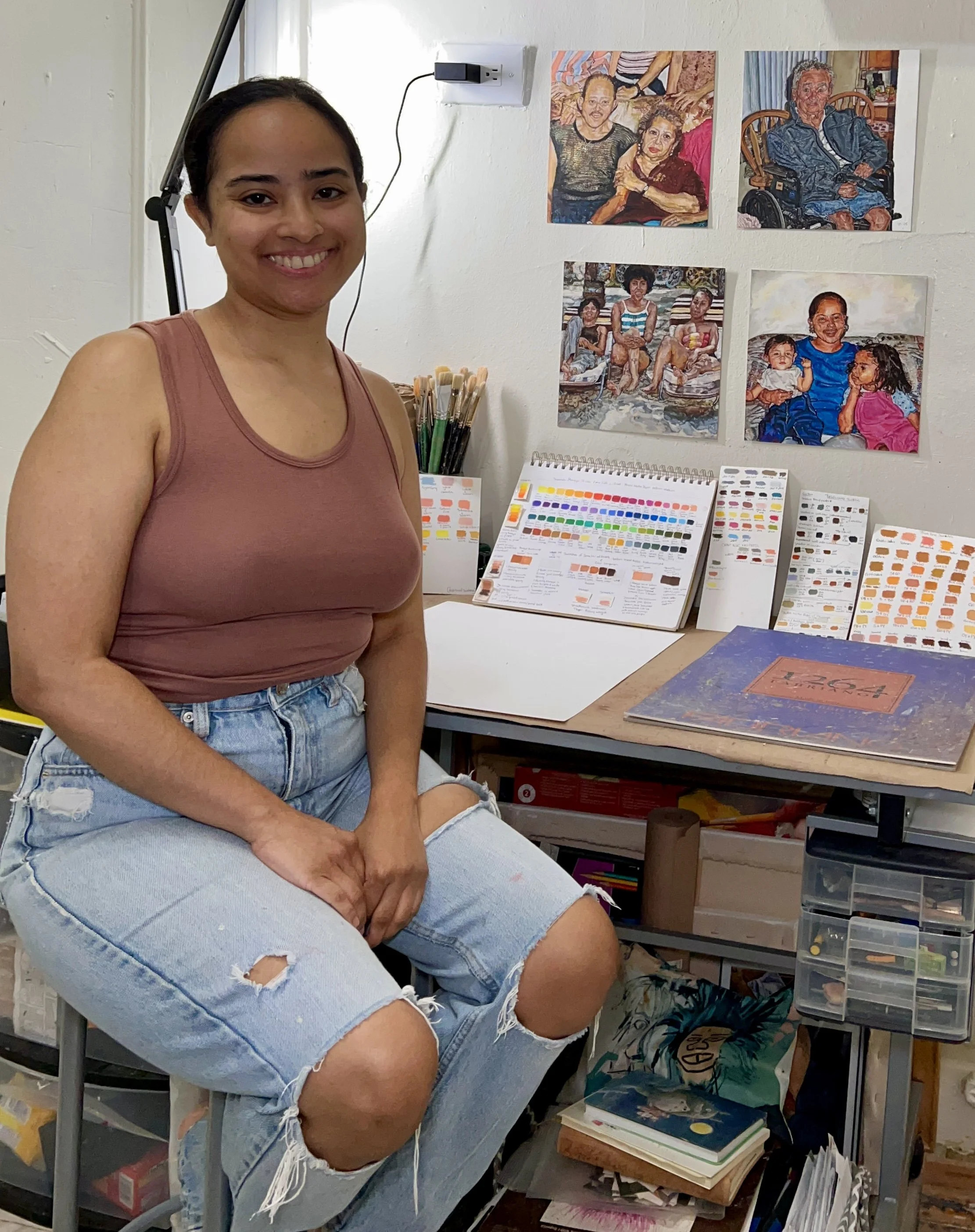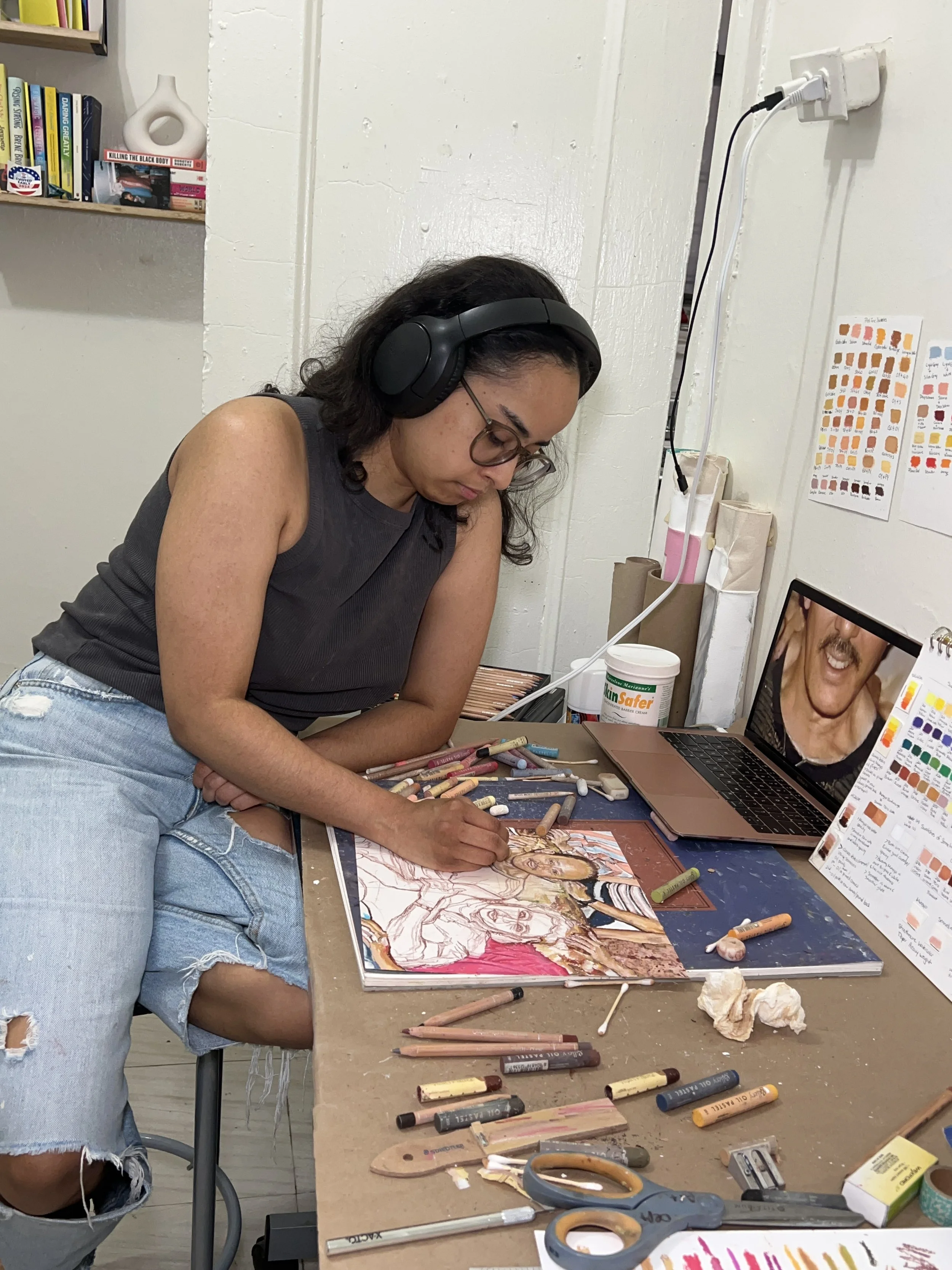I recreate familiarity through pictures that tell a story about family dynamics, identity, vulnerability, culture, and community, that hold symbolic meanings. My discovery of oil pastels was a new found love. There is a form of intimacy when working with oil pastels through the physicality between my hands pressed against, almost imprinting onto the pastels, and my body drawing closer, looking deeper, applying finer details into each portrait I make. I find similarities when working with the medium and the subjects I draw. Life can be raw, messy, and beautiful all at once. There is a connectivity, a oneness between my body, and the medium that is messy where something beautiful comes out of it. Creating small-scale portraitures allows me to recreate those sensations, that intimacy making the work, looking deeper at the image and finding newness in who I’m capturing each time I revisit. I feel closer to my roots, community, being Boricua, and finding a deep understanding of myself, and my family. Each image that I recreate are sourced through photographic archives found on social media; Facebook, that are physically inaccessible to me. I’m accentually redeveloping digital images through pastel drawings to preserve, connect, and reconnect and have physical images to those memories. My paintings are drawn from my life and the challenges that come with having physical ailments. There is vulnerability in my selected compositions through pictures taken from hard moments in my life. I paint with intension, selection, and looking beyond the image by unveiling and amplifying various shades of values, and temperature to create feeling, understanding, and empathy. The figure in each of my paintings are in the present, looking away from the viewer, allowing the viewer to look through the surrounding boarders acting as a window. Through my process of selecting images, I gravitate towards images surrounding furniture and specific location. I want to draw the viewers inward capturing the attention, and essence of space surrounding the subject, to create context, and understanding of who these people are and the lives they lived. I want my paintings and drawings to provoke a strong feeling that is liberating and convey a strong sense of vulnerability and relatability.